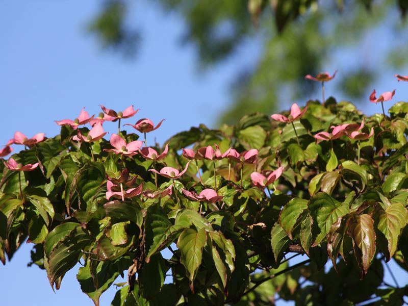 ・ 季節のめぐりを感じます。 ふと、見上げるとピンク色のヤマボウシが彩っていました** 樹形が整っていて、個人的には大好きな花木です。 じつは....花のように見えるのは本来の花弁ではなく、 総苞片(花のつけ根の葉)なんんです!! 夏の終わりに甘くて美味しい果実が紅橙色に熟し、 今年も目が話せない花木です♪** ↓ ↓