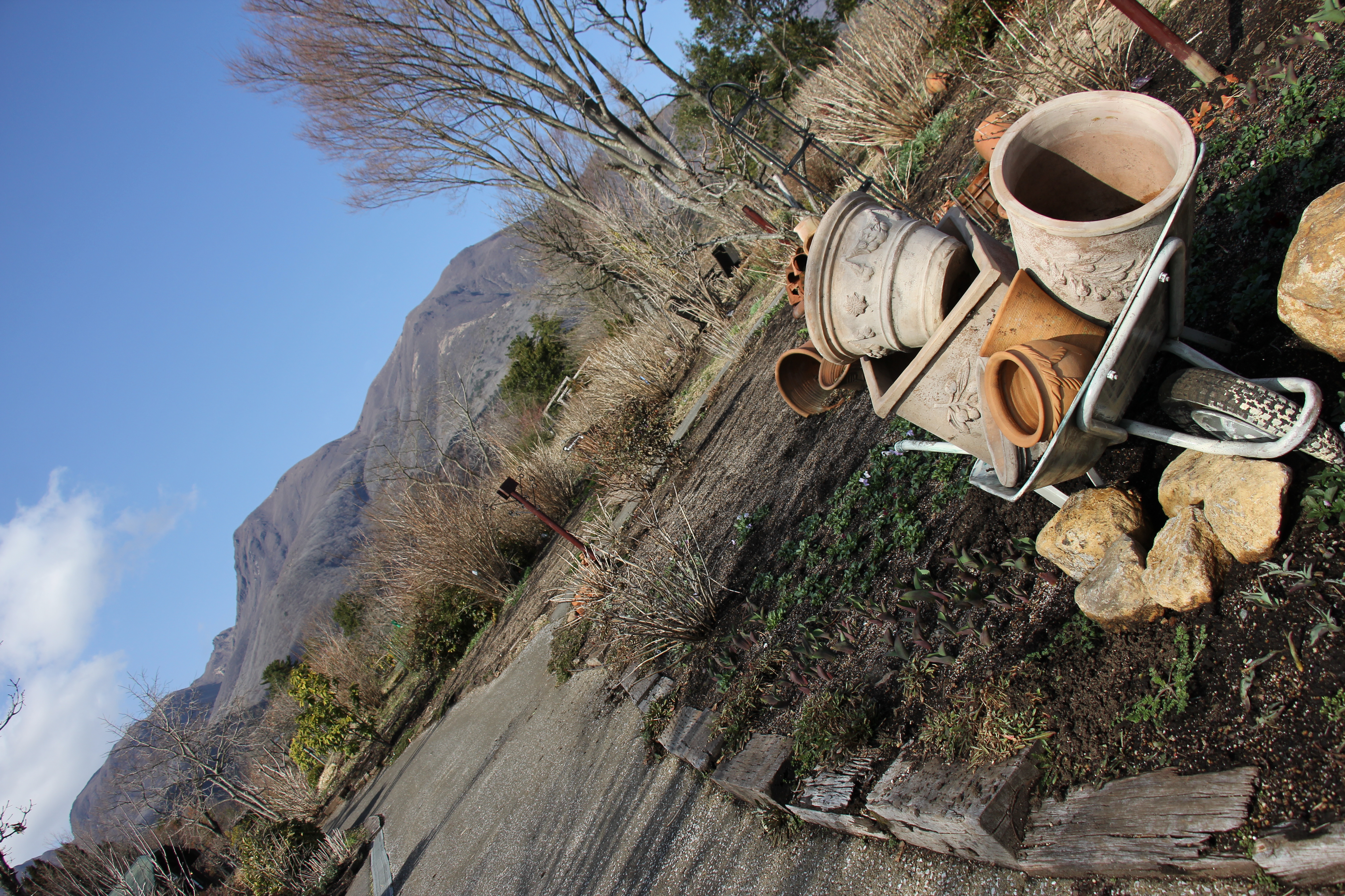 テラコッタの鉢をガーデンのアクセントに仕様しており、