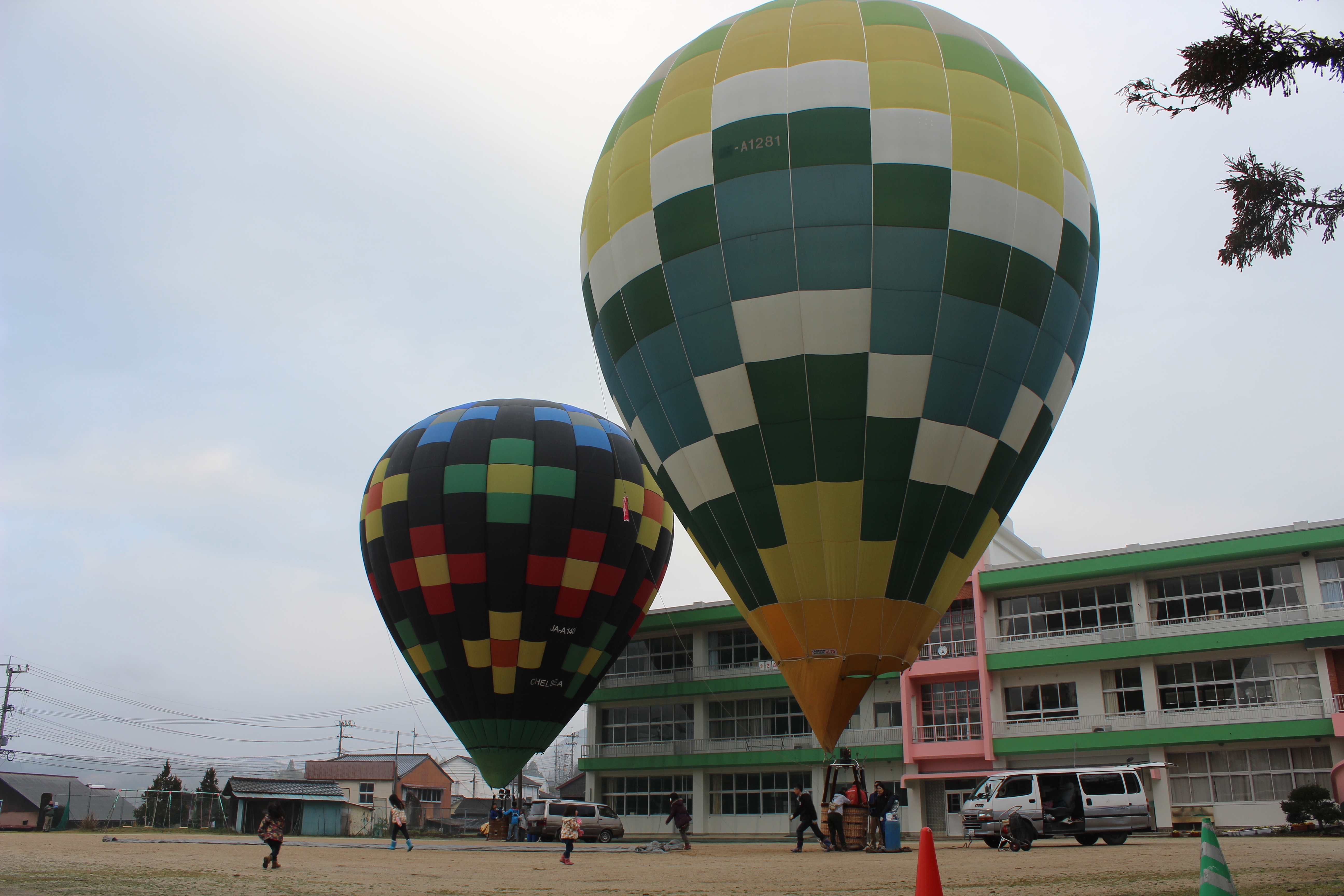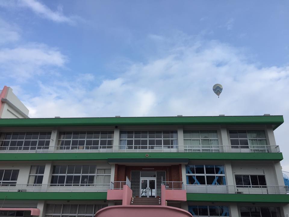 早朝くじゅう花公園前から、熱気球試験フライト予定でしたが、 濃霧のため、近隣の小学校からの試験フライトとなりました。 ↓ ↓